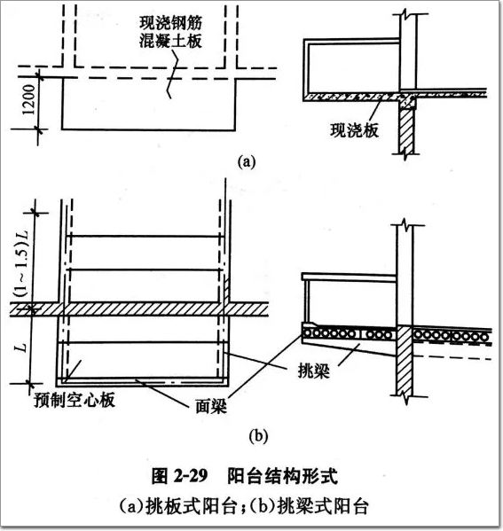 陽臺(tái)形式很多,在使用方面,有生活陽臺(tái)、服務(wù)陽臺(tái)。生活陽臺(tái)供生活起居之用,服務(wù)陽臺(tái)為從事家務(wù)活動(dòng)等用。而陽臺(tái)結(jié)構(gòu)形式有挑板式陽臺(tái)和挑梁式陽臺(tái)兩種,見下圖。