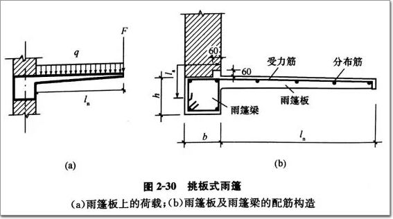 雨篷板為一典型懸臂受彎構(gòu)件。雨篷板承受的荷載除有恒載(板自重、面層、抹灰等構(gòu)造層重)、均布活荷載(詞條“活荷載”由行業(yè)大百科提供)外,還應(yīng)考慮施工荷載或檢修的集中荷載,見上圖(a)。