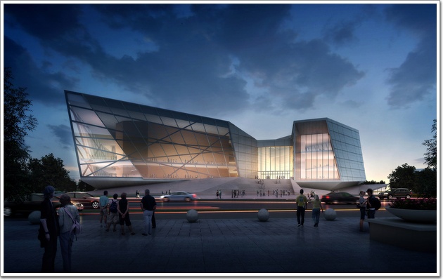 該項目由哈爾濱工業大學建筑設計研究院負責整體設計,其中音樂廳靈感來源于名聞天下的鈞瓷,自然淡雅,恰如雨過天晴,天成之色若隱若現。劇場采用“南外北內,兩橫四縱”的整體功能框架。左右由小到大依次陣列戲曲劇場、音樂廳、歌劇院,觀眾廳南置,舞臺北置。南側一橫水龍大廳串聯四個觀眾廳,各廳迅速可達。北側一橫服務長廊串聯整個后臺區,各廳舞臺直接對應各自后臺區域,管理方便。運用“四縱”串聯水龍大廳、貴賓區、后臺區,聯系緊密。