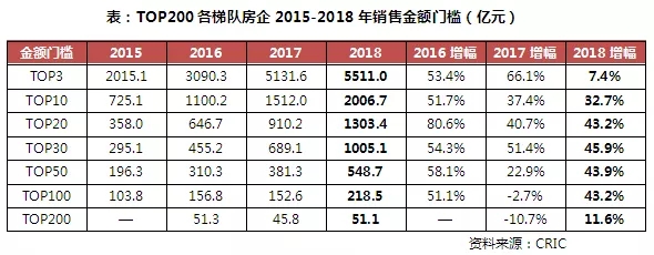 2018年,TOP100各梯隊房企銷售金額門檻進一步提升。分梯隊來看,TOP3房企門檻雖然已超5500億元,但門檻增幅較前兩年大幅降低。TOP20、TOP30和TOP50房企的門檻增幅都在44%左右。值得注意的是,2018年TOP10門檻超2000億元、TOP30門檻已達千億。另外,TOP100房企的門檻增長近43%達218.5億元,而TOP200房企的門檻則繼續保持在50億元左右。