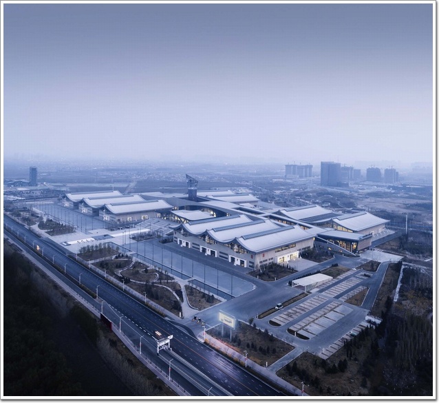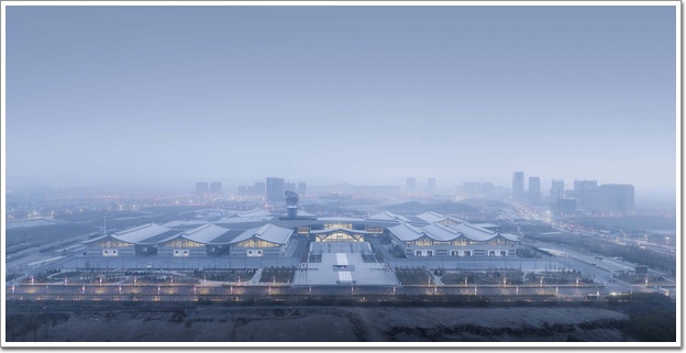 石家莊國際會展中心的建筑取“碧水宏橋”之意,借鑒千年古城建筑元素,吸取趙州橋拱和隆興寺的精華,將地域文化特色與懸索結構設計巧妙結合。而搭配建筑設計語境,項目景觀注重由自然過渡到城市,展現出山水環抱新城的概念。