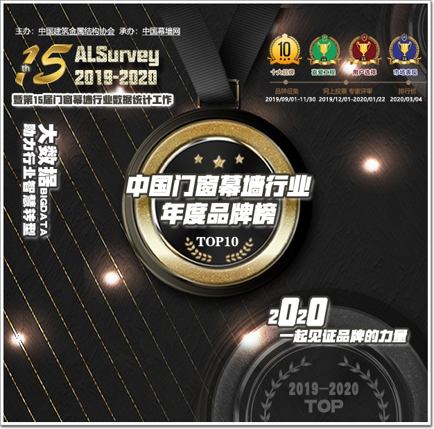 大數據——助力行業智慧轉型,為高質量發展賦能!本屆活動于2019年8月由鋁門窗幕墻分會授權,經中國幕墻網ALwindoor.com發起,并以全國門窗幕墻行業“第15次門窗幕墻行業數據申報工作”的形式,進行品牌的入圍征集。在入圍品牌名單公示完成后,將于2019年12月正式啟動網上投票和專家評審,直到2020年2月1日結束。而排行榜單的公布及頒獎典禮,將在2020年3月4日的廣州年會上舉行,屆時我們將邀請您,2020!共同見證品牌的力量……