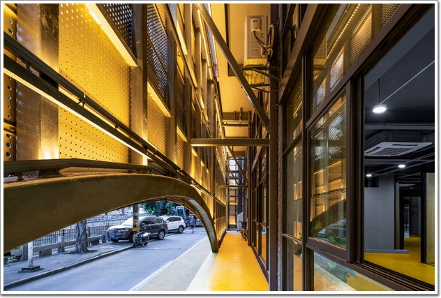 金色大幕將其在街角的顯著位置接管過去,它謙虛地隱身其后。蔬菜公司則改建成聯合辦公,并保留了仿古立面,設計師用有限的資金投入到沿街的控制性立面上,黃色瀝青鋪滿空地,銜接了室內的黃色地坪,呼應立面的金色并明確了設計的邊界。到了晚上,金色退位給面紗一般半透明的帷幕,泉州的市花刺桐花則悄悄綻放在這個帷幕之上,煞是好看。