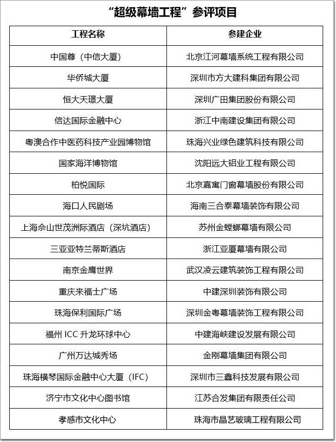 “超級幕墻工程”參評項目名單