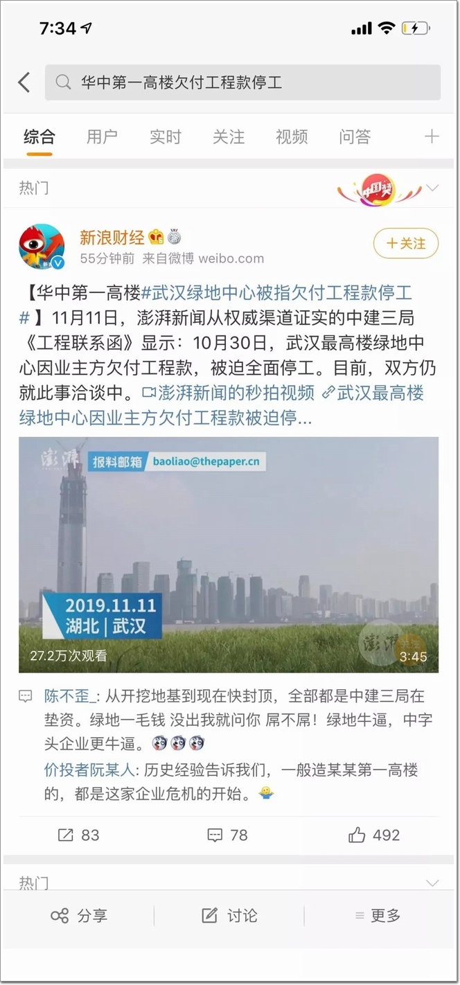 11月11日,澎湃新聞從權威渠道證實的中建三局《工程聯系函》顯示:10月30日,武漢最高樓綠地中心因業主方欠付工程款,被迫全面停工。目前,雙方仍就此事洽談中。