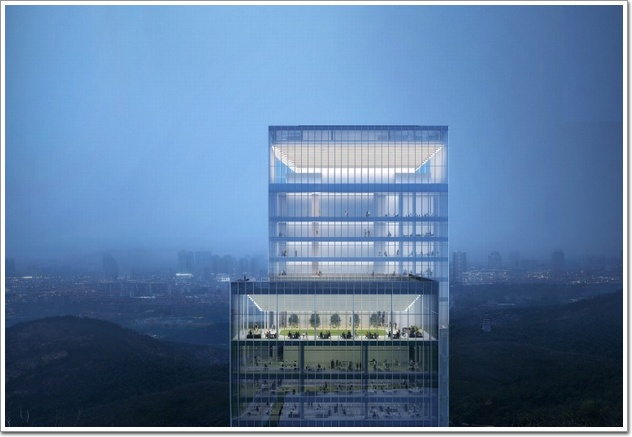 幕墻不僅是建筑輪廓的勾勒,也是對內部空間進行雕塑和保護。建筑在塔冠巧妙地使用幕墻語言,以透明的玻璃幕墻配合燈光照明表達“光之谷”的概念,既與整體設計呼應統一,又與塔身辦公區域進行了功能區分示意,同時也將預留機房、擦窗機等基礎設施集中安置在主冠的“谷”中,既不影響整體視覺效果,又能讓功能統一純粹。