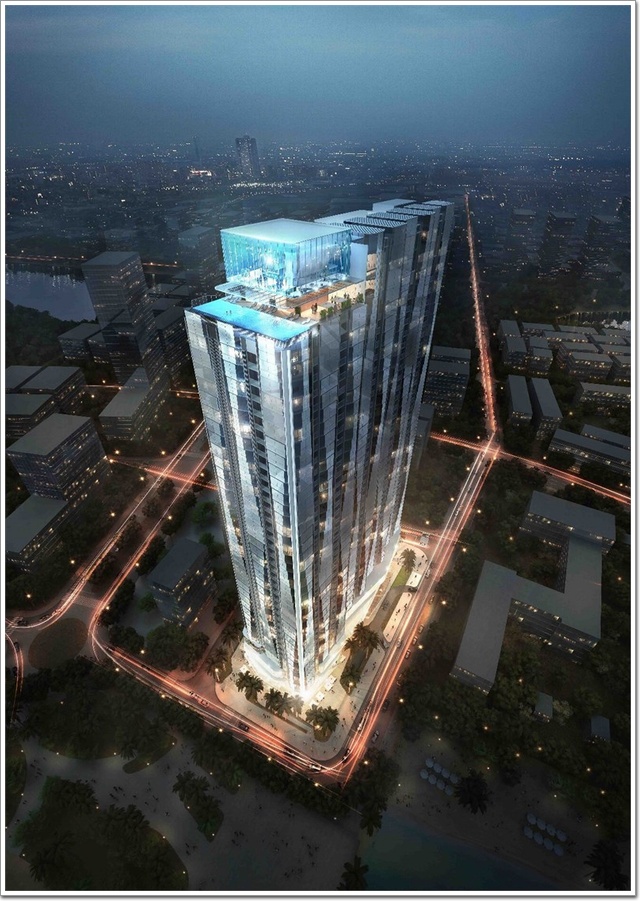 建筑設(shè)計完美融合現(xiàn)代與傳統(tǒng),呈現(xiàn)當(dāng)代環(huán)境下越南文化的獨特元素。建筑立面設(shè)計靈感源自起伏的海浪。35層高的塔樓坐落于4層裙樓之上,總建筑面積80000 平方米,其功能包括酒店、服務(wù)式公寓、餐廳、宴會廳、會議室、健身房及四季恒溫泳池、spa設(shè)施和購物中心。