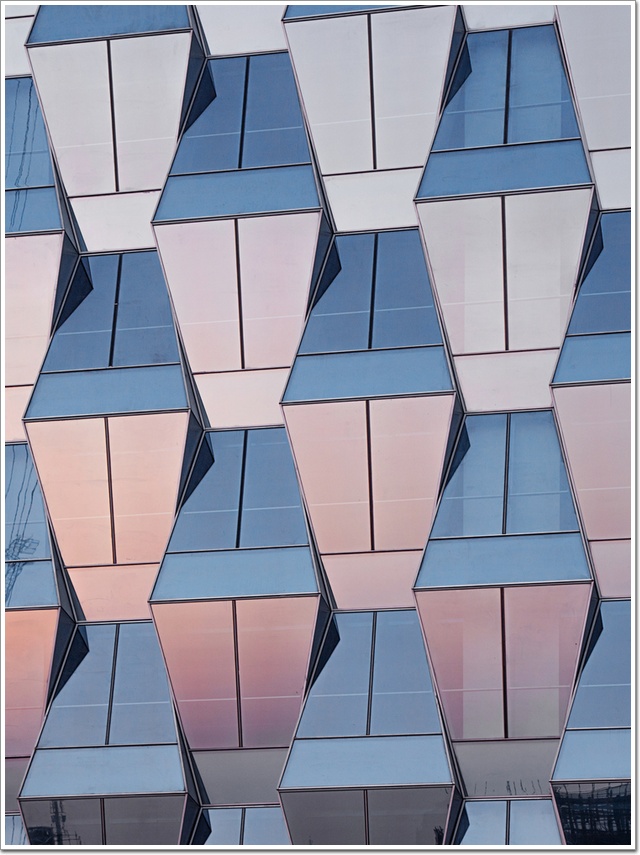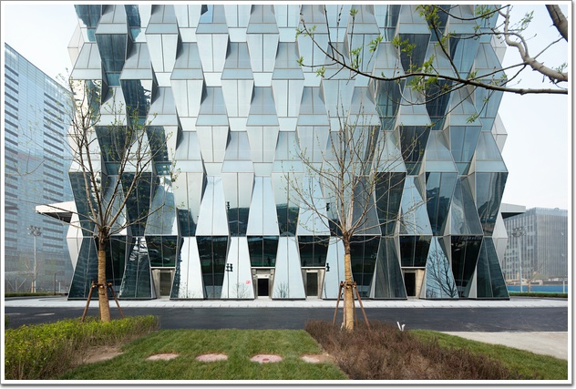 為應(yīng)對北京多云的天氣,塔樓吸收并折射陽光,為周邊街區(qū)帶來活力。大廈采用簡單的長方形平面布置,外立面圖案采用了浮雕雕刻技術(shù),由兩種梯形玻璃棱鏡共同組成完整立面系統(tǒng),形成自遮陽系統(tǒng)從而增強(qiáng)建筑的環(huán)境友好性,梯形每個面都由兩個垂直的、低輻射隔熱玻璃板組成,梯形窄端朝向天空或是下方街區(qū)。這種梯形表皮增強(qiáng)了建筑的視覺沖擊力,并為立面提供了自遮陽系統(tǒng),提高了建筑物的環(huán)保性能,可見項目在玻璃幕墻的運用上下足了功夫。