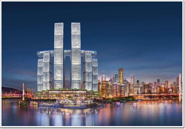 項目設計的亮點是象征重慶“梯坎”面貌的水晶廊橋,350米高,最高冷彎單元玻璃幕墻;連接4座塔樓、位于60層樓高空長達約300米的“水晶廊橋”,其晶瑩剔透的玻璃構造,將把公共空間及城市花園帶