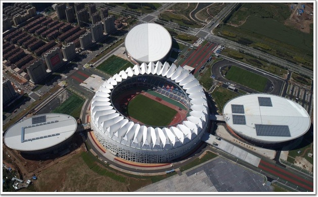 據中國幕墻網ALwindoor.com小編了解,體育場的馬鞍狀自平衡索膜結構屋頂,在全國屬首次使用。體育場屋蓋的結構體系是由鋼結構系統、鋼索系統和膜系統3部分組成。其中鋼結構系統布置在體育場的外圍,由三角形巨型空間環桁架、桅桿和斜撐桿組成。膜系統投影面積2萬多平方米,展開面積近3萬平方米。鋼索結構整體規模、索的直徑以及膜結構展開面積這三項,均做到了國內第一。
