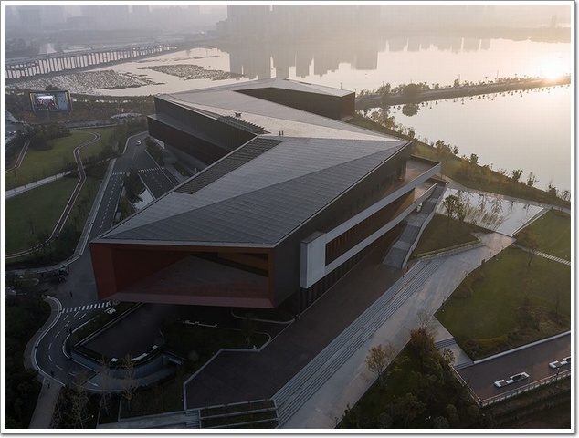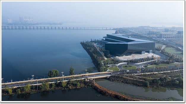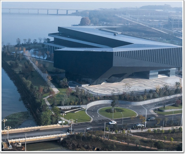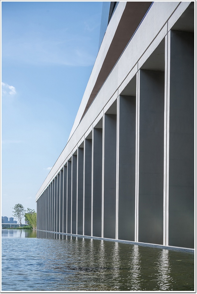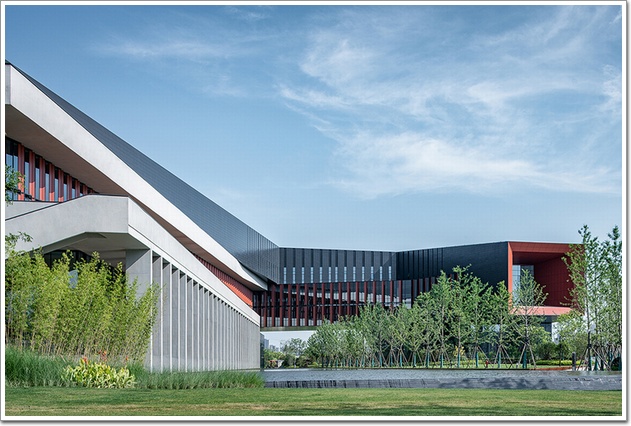在外立面方面,線型建筑通過三次轉折完成了平面塑造,立面幕墻主機理也是連續折線,這想法來自風吹動湯遜湖水產生的褶皺紋。面湖的兩個方向是利用柱陣和全玻璃幕墻打開視線,有些學院風格。南邊主入口是削切和架空的硬質“黑色盔甲”,東面是三色疊加的扁平帶狀,南和東面都很硬,有面對城市的清晰姿態,并不總是“友好的微笑”。