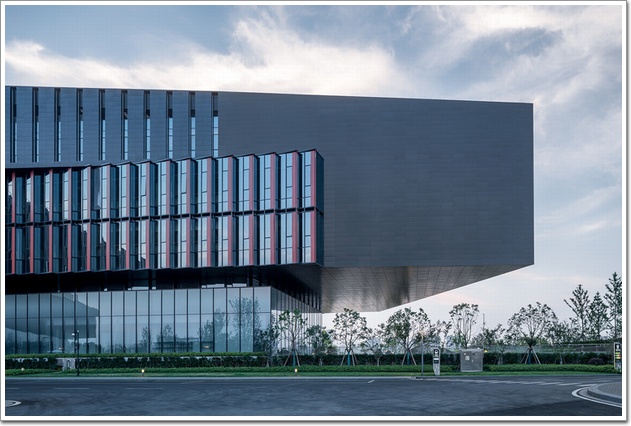 武漢研發中心共用了三種變化的玻璃幕墻,加上黑色金屬板幕墻和清水混凝土處理,雖然五個面的姿態完全不同,但被豎向的細節統一,五層建筑在1:10的高寬比例中,顯得舒展而且精致。有意思的是建筑用材是玻璃金屬板和混凝土,基本呈現出黑紅白三色,和騰訊的企鵝LOGO標識相同,這是純屬巧合還是故意為之小編便不得而知了。