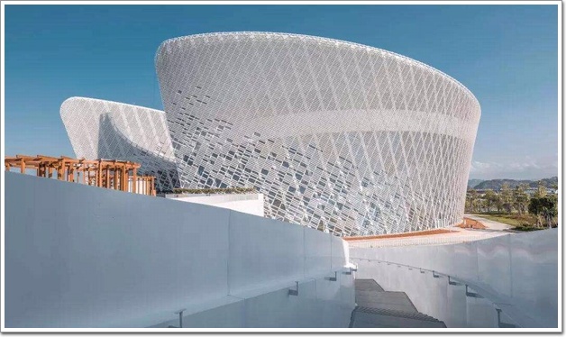 海峽藝術中心外觀造型由雙曲的兩面外墻組合,猶如花瓣一般,五朵花瓣匯聚在一起仿佛茉莉花綻放,花瓣間由一片巨大的廣場相聯通,江畔另設3座花瓣形觀景平臺,由此構成福州“市花”茉莉花的造型,極具夢幻效果。外觀大面利用了陶板與陶輥,潔白的顏色營造出圣潔的美麗,“陶”與“白”也是中國元素的終極表達,是一座極具中國特色的“東方悉尼歌劇院”。