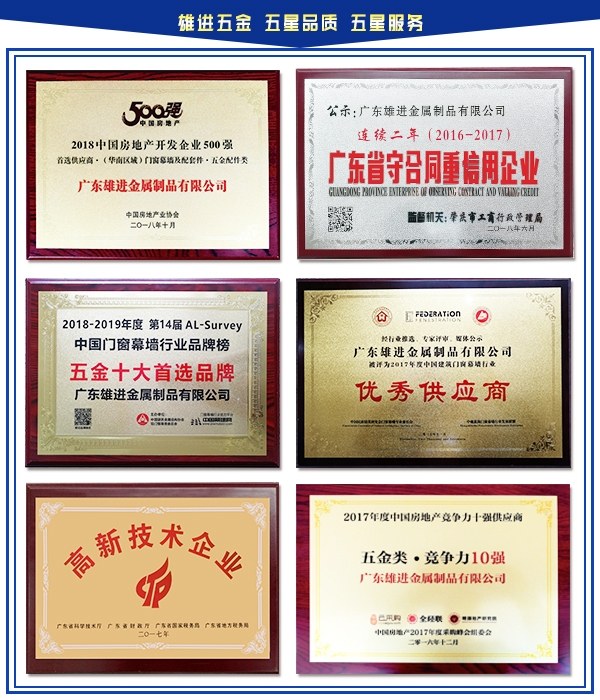 雄進(jìn)五金用優(yōu)質(zhì)用心的服務(wù),成就了《廣東省著名商標(biāo)》、《中國名優(yōu)產(chǎn)品》、《中國質(zhì)量信譽(yù)服務(wù)AAA級示范單位》、《中國房地產(chǎn)最有影響力門窗品牌》、《中國質(zhì)量過硬服務(wù)放心信譽(yù)品牌》、《中國建筑金屬結(jié)構(gòu)協(xié)會推薦產(chǎn)品》、《2017年度中國房地產(chǎn)競爭力十強(qiáng)供應(yīng)商》,通過了ISO9001:2008國際認(rèn)證體系,更成為了中國建筑結(jié)構(gòu)協(xié)會單位以及中國五金制品協(xié)會理事單位。