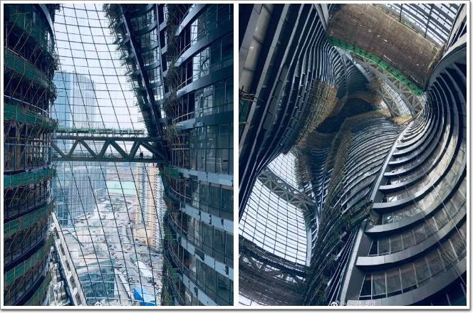 整個建筑的結構看上去特別像是一個酒桶,內部是兩個核心筒,外部是一堆鋼管柱包圍,然后用一道道的橫箍圍繞固定,這些橫箍在中庭部分表現為空中的連橋。而最終讓建筑結構能夠通過包括地震模擬等各種考驗最為重要的元素就是這個東西,這個也很好理解,一個酒桶能不能結實最主要的不是木頭結實不結實,而是能不能箍住。