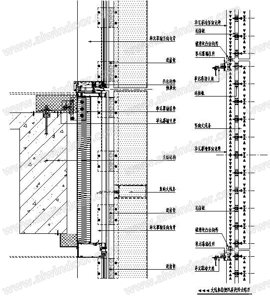 采用此體系設計,單元幕墻豎向龍骨僅需在頂部承擔大線條的側風荷載,主要為傳導作用,單元幕墻豎向龍骨本身受影響不大,單元板塊之間不需要傳遞豎向大線條的側風荷載,單元幕墻豎向龍骨的底部不需要特殊處理,按傳統單元幕墻的插接方式設計即可。