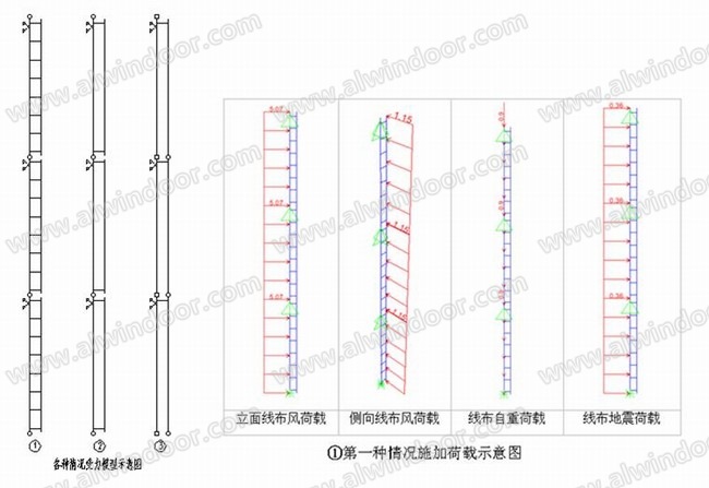 根據實際情況,鋁立柱與裝飾條整體建模計算,建立三跨模型,取中間跨結果作為幕墻立柱校核的依據。立柱按多跨簡支連續梁模型計算,荷載及組合按廣東省標準《建筑結構荷載規范》(DBJ 15-101-2014)設計,各種情況受力模型及SAP2000模型施加荷載如下圖六所示:
