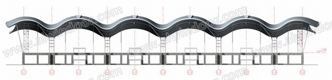 新建T2A航站樓主樓部分建筑平面為90米×180米長方形,地下一層,地上兩層,局部夾層三層,建筑標(biāo)高7.500米以下為混凝土框架(詞條“框架”由行業(yè)大百科提供)結(jié)構(gòu),建筑標(biāo)高7.500米以上為大跨度空間鋼結(jié)構(gòu),建筑最高點(diǎn)約30.7米。屋面鋼結(jié)構(gòu)采用四角支撐鋼柱每36米均勻布置;兩側(cè)山墻部分屋面鋼結(jié)構(gòu)采用單鋼管支撐鋼柱沿建筑軸線每9米均勻布置。正立面(陸側(cè)部分)的外墻檐口呈波浪形,最低點(diǎn)為24.175米,最高點(diǎn)為28.874米;背立面(空側(cè)部分)的外墻檐口也呈波浪形,最低點(diǎn)為20.411米,最高點(diǎn)為26.852米;兩側(cè)山墻頂端為一光滑曲線,最低點(diǎn)為23.072米,最高點(diǎn)為30.608米(如圖2)。