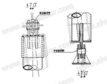 抗風(fēng)柱底部及頂部耳板連接位置設(shè)置專業(yè)加工的轉(zhuǎn)動軸承構(gòu)件,可以實(shí)現(xiàn)抗風(fēng)柱平面內(nèi)水平方向的轉(zhuǎn)動變形,變形量±7°(圖9)。