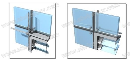 為滿足其在自重荷載及風(fēng)荷載作用下的結(jié)構(gòu)安全性能,在玻璃百葉的中部位置采用不銹鋼拉索將百葉片吊掛在鋁合金百葉框上,鋁合金百葉框的表面采用灰白色氟碳噴涂處理,百葉片的外表面與大面玻璃面齊平,以滿足幕墻立面外飾效果的要求。