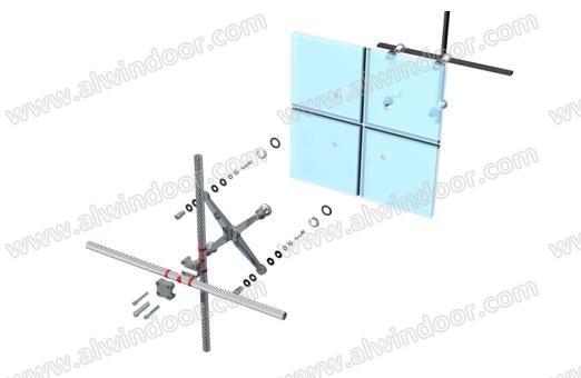 玻璃百葉通過不銹鋼夾板與鋁合金框連接,玻璃百葉整體單元安裝完畢后,與單索幕墻不銹鋼點(diǎn)爪通過4個M12的不銹鋼裝飾螺栓固定。