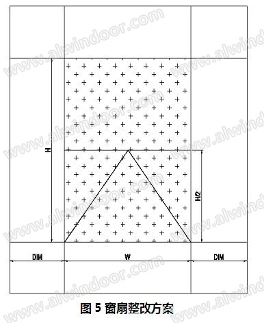 減小了開啟扇面積,降低了風荷載作用的影響,增加了安全系數。而且大部分鋁型材仍可用原模具,節省了開模費用和時間。但此方案更改了原設計分格,外立面視覺效果與現狀會有較大差異。