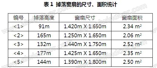 統計5樘掉落窗扇的尺寸和面積如表1: