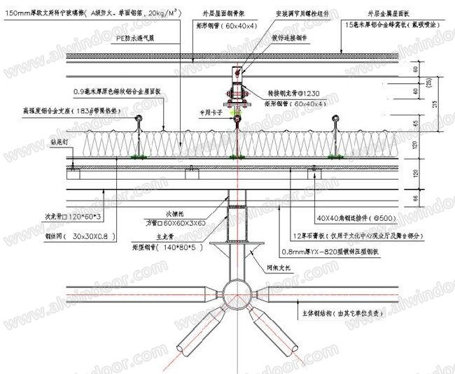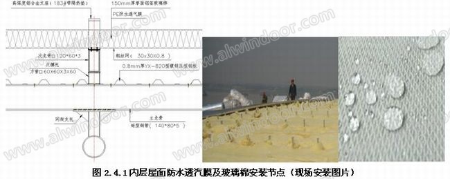 2.4.1防潮、防結(jié)露設(shè)計:本工程在內(nèi)層屋面次龍骨上鋪設(shè)一道30x30x0.8鍍鋅鋼絲網(wǎng),在鋼絲網(wǎng)上鋪設(shè)一層PE防水透汽膜,然后再鋪設(shè)150㎜厚單面鋁箔玻璃棉, (如圖2.4.1所示)。