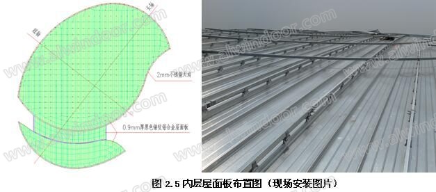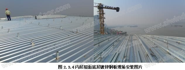 內(nèi)層屋面的底層防水鍍鋅鋼板采用0.8㎜厚YX-820型鍍鋅壓型鋼板,可解決屋面伸縮變形的問題,又為安裝人員提供了安全可靠的踏板,應(yīng)避免施工時損壞底層鋼板(如圖2.3.3-2.3.4所示)。