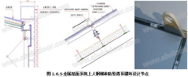 2.6.5金屬屋面系統(tǒng)上人鋼梯和防墜落系鎦環(huán)設(shè)計:為便于金屬屋面的維修與清潔維護(hù),文化中心在造型凹溝的隱蔽部位安裝有上人鋼梯(用鋼管制作,表面氟碳噴涂),防墜落系鎦環(huán)根據(jù)屋面的造型設(shè)置,間距6米左右,確保屋面清洗人員能夠安全清洗整個屋面。防墜落系鎦環(huán)采用鋼板制作(表面氟碳噴涂),穿過外層屋面板的板縫,安裝在外層屋面環(huán)形鋼框架梁上。維修與清潔維護(hù)人員經(jīng)上人鋼梯上到屋面,將清洗用的軟梯或安全繩索通過卡扣懸掛在防墜落系鎦環(huán)上,清潔人員在軟梯或安全繩索上對屋面進(jìn)行清潔(如圖2.6.5所示)。