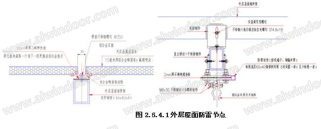 具體防雷做法是將每個單元鋁副框一個角下面一段彈性墊更換成鋁合金墊片,構(gòu)成有效的防雷引下導(dǎo)通點,將接觸表面的鋁板或鋁型材去除氧化膜保護(hù)層,直立鎖邊鋁合金專用卡子與卡子轉(zhuǎn)接鋼件通過防雷組件(接線端子、銅編織帶)連接構(gòu)成有效的防雷引下導(dǎo)通點,內(nèi)層屋面的防雷做法是采用防雷組件(接線端子、銅編織帶)(上側(cè)與鋁合金T型支座連接,下側(cè)與次鋼龍骨連接 ),構(gòu)成有效的防雷引下導(dǎo)通點,形成外層金屬屋面板→外層屋面鋼骨架→內(nèi)層金屬屋面板→鋁合金T型支座→鋼檁條→屋面主體鋼結(jié)構(gòu)的可靠導(dǎo)通電路,屋面每個防雷引下導(dǎo)通點的間距不大于8m(防雷做法如圖2.6.4.1-2.6.4.2所示)。