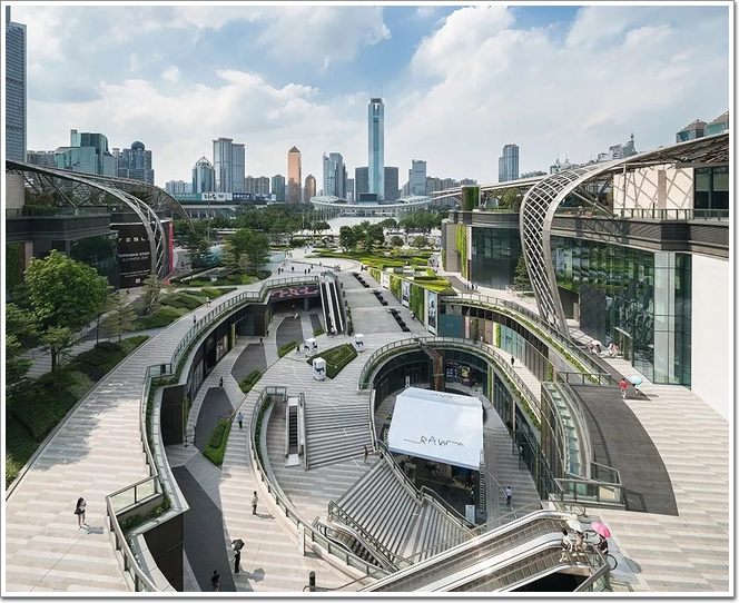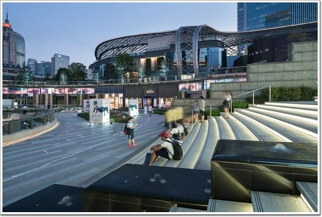 開放式的景觀與周圍街景相融,公園般的環境讓人倍感舒適,建筑頂部也遍布綠化景觀,景觀的設計一直被延伸至下沉廣場,人們也不自覺的入了“坑”。