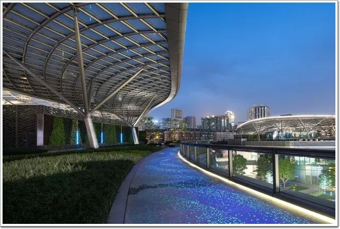 “雙鯉魚”頂部天幕由網狀的鋼結構材料組成,分別形成2張金銀兩色的鋼結構(詞條“鋼結構”由行業大百科提供)網,從遠處看神似魚鱗,兩層的魚形樓環繞中央花園而建,通過人行天橋連接,左右對稱,自帶靈動的韻律美。