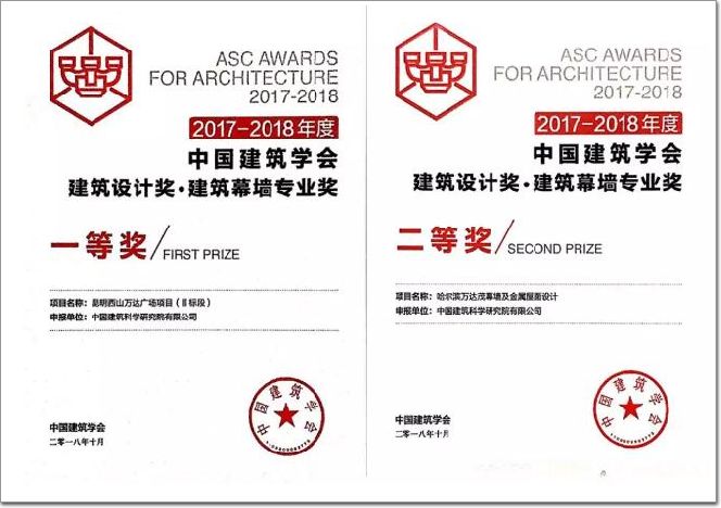 在過去的一年里,中國建研院幕墻所收獲頗豐,不僅被評為17-18年度建筑幕墻顧問咨詢行業20強,設計作品還榮獲17-18年度中國建筑學會建筑設計獎·建筑幕墻專業獎一等獎和二等獎。