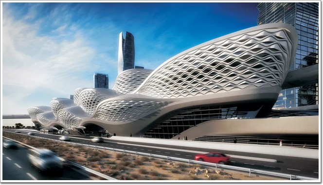 Riyadh Iconic Station項(xiàng)目位于沙特首都利雅得,是利雅得地鐵站總站。其外觀花紋靈感來自于沙漠中的沙丘,不斷重復(fù)的正弦波交織相錯(cuò),為該建筑增添了靈動(dòng)流暢的視覺效果。地鐵站外觀呈三維立體結(jié)構(gòu),這樣的外觀構(gòu)造不僅減少了太陽熱量的吸收,而且又讓地鐵站與周邊環(huán)境完美融合。
