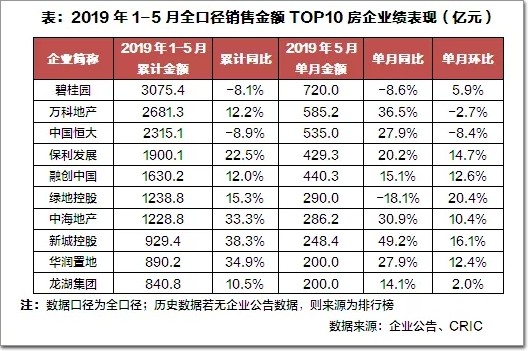 截止5月末,已有7家房企的全口徑銷售金額破千億。2019年1-5月,保利、綠地、中海、新城、華潤等房企銷售表現較為突出,累計業績增速明顯高于行業平均水平。TOP3龍頭房企中,碧桂園1-5月實現全口徑銷售金額3075.4億元,5月單月實現720億元,環比小幅提升。萬科、恒大5月單月的業績規模也分別達到了585.2億元和535億元,較上月有所下滑。