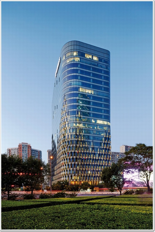 同時,這種呈現編織效果的玻璃立面為通風提供了新的方式。這種機理上添加的小開口能起到自然通風的效果。在北京大多數的甲級寫字樓項目中,窗戶是非常大而且很重,上懸窗不易操作而且具有容易脫落的隱患。因此許多建筑商不允許開窗,但空調通常在下午6點之后和周末的時候關閉的。這個問題對那些需要加班工作的人來說是個極大的困擾,那么這樣的設計便成為加班人士的福音,要知道,在生活節奏如此之快的帝都,每天都有非常龐大的人群在寫字樓里加班。