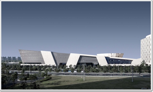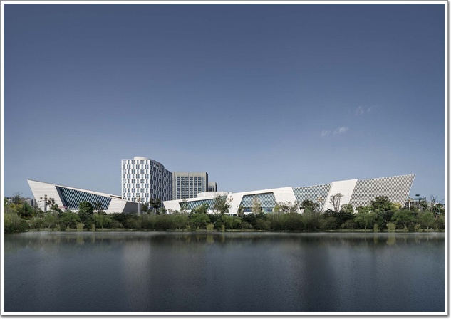 由于各館的功能對自然采光通風需求有所不同,如門廳、藝術沙龍、創作室、閱覽室、音樂廳、展廳等,外立面則均以玻璃幕墻、石材百葉、大面積實墻等作為對應,以求虛實相生、合而不同。項目還基于鬧靜分離原則,將文化三館中較“鬧”的文化館與較“靜”的圖書館分設兩端,美術館居中調和。并且東南端朝向好,視野開闊,適合做圖書館,還能同大尺度的城市空間取得和諧。