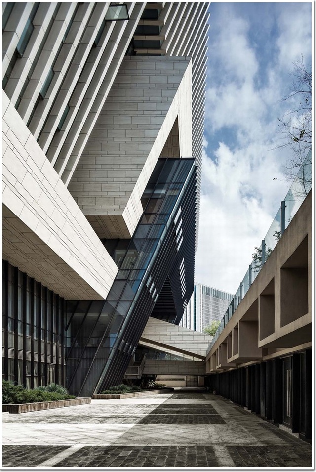 項目整體通過壓低建筑的中部,將各館脫開成庭院,輔以各式灰空間,實現室內外交融,并與周邊城市開放空間互為滲透,為相鄰待開發地塊留出景觀綠脈和視線通廊。圖書館為獲得更多的戶外景觀空間,建筑結合外傾墻面,層層疊疊設置了多處陽臺、露臺、屋頂花園和灰空間,長80米的鋼筋混凝土結構,懸挑達12米。