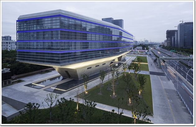 整個建筑體為一座橫向的棱形玻璃大樓,坐落于一座宏偉清水混凝土基座之上。建筑體在城市環境中從東、西、南三個方向上呈現獨立而引人注目的姿態。橋型混凝土基座之下的空間成為臨近公園的延伸,構建出一個可以遮風避雨的城市公共空間,可以供市民休憩社交,也適宜舉辦室外活動。