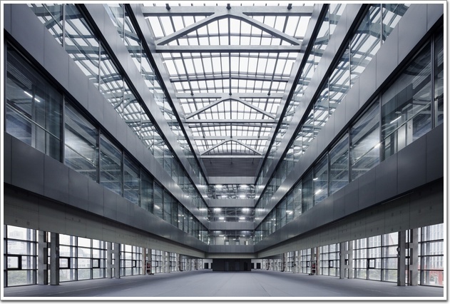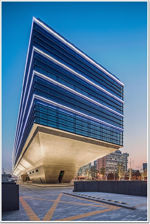 在1樓和2樓采用大面積清水混凝土之后,3-6樓外立面采用玻璃幕墻,兩者的搭配毫無違和感。鋁合金框架雙層自呼吸玻璃幕墻起到了良好的隔音隔熱作用, 幕墻空腔內安裝有遮陽百葉。幕墻外層設有通風孔隙,可實現幕墻體自然排熱,內層設有可開啟窗扇。