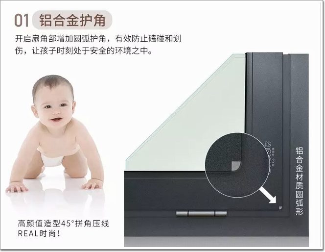 相信大家常常都會有這樣的經歷,在家里打掃衛生,一不小心就會被窗戶的直角或是尖銳處劃傷。大人尚且如此,活潑好動的小朋友就更不用說了。所以,在選購門窗時,應該盡量選擇邊角較為圓滑或是有圓弧護角的窗戶。