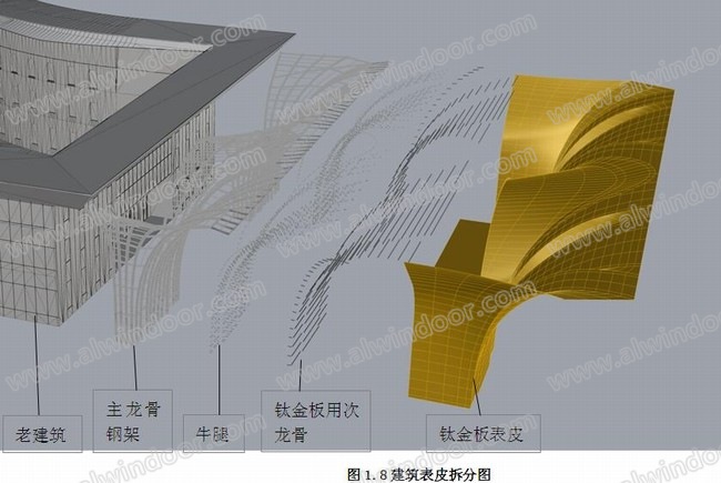 改造增加的新的表皮是淺香檳色的金屬板--鈦金板,完工效果如圖1.6、1.7.
