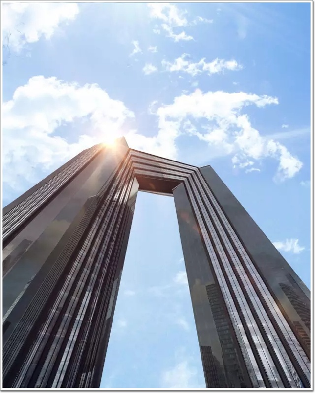 領地環球金融中心位于天府新城核心區,規劃設計由美國思納史密斯設計公司擔綱,項目整體以“黑鉆凱旋門”為造型,由兩棟206米超甲級寫字樓構成,法國凱旋門以其威武雄壯的外在形象意味著勝利,炫耀著軍功,而“凱旋門”形象第一次來到中國西部,該項目則用其形,領其神,在此基礎上,打造出44~47層空中連廊,這也是整座大廈最具特色的部分之一。