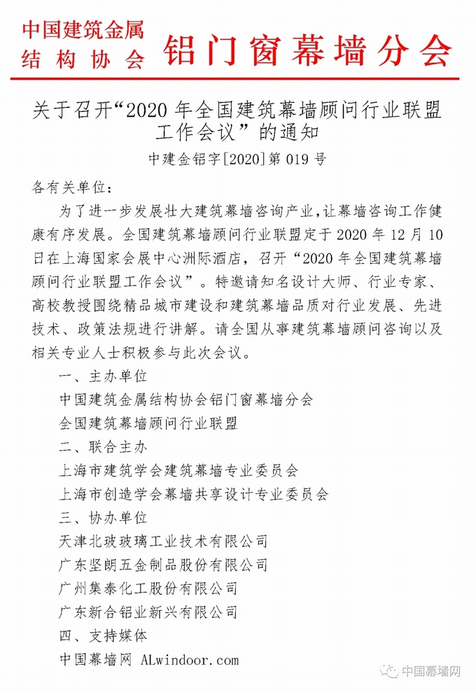 關(guān)于召開“2020年全國(guó)建筑幕墻顧問(wèn)行業(yè)聯(lián)盟工作會(huì)議”的通知