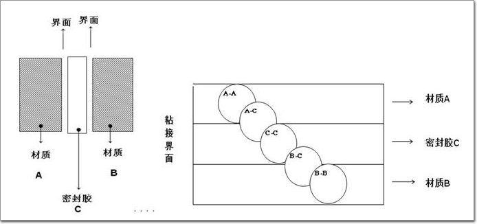 3. 若A-C或B-C最小, 則引起粘接破壞, 即密封膠與材質(zhì)間之界面破壞。