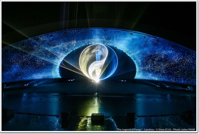 而內部,將自然景觀融入到建筑中,觀山觀水觀秀,將水舞與激光引入劇場,打造大型新形式劇場模式。舞臺空間寬而空闊,有如宇宙之初,兩個斜面相接,有如天地。頂部的天眼則象征太陽和月亮,也呼應中國古代“天圓地方”的說法。其次在內部材料運用中,室內屋頂采用光潔度較高的鋁板,最大化減少由于設備造成的視覺干擾。