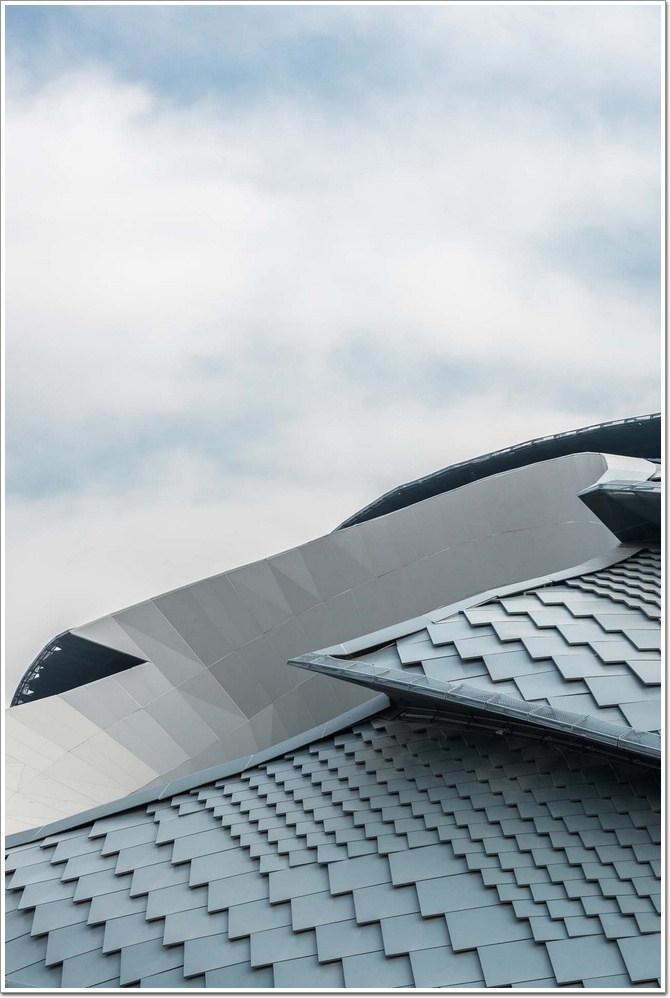 由于項目鄰近中國傳統古鎮, 劇場外部造型吸收了當地傳統建筑的元素,傳統村落層層疊疊的屋頂排列(如⻄固河口古鎮)。屋頂表皮經過反復修改,采用復雜的網架結構,設計提煉了河口古鎮中瓦的元素,采用金屬鋁板幕墻以錯拼的方式模擬古瓦的拼接效果,將金屬板之間相互覆蓋,大小板塊層層疊加,猶如巨鳥的羽翼一般,具有韻律地自上而下覆蓋疊加,產生升騰之感。