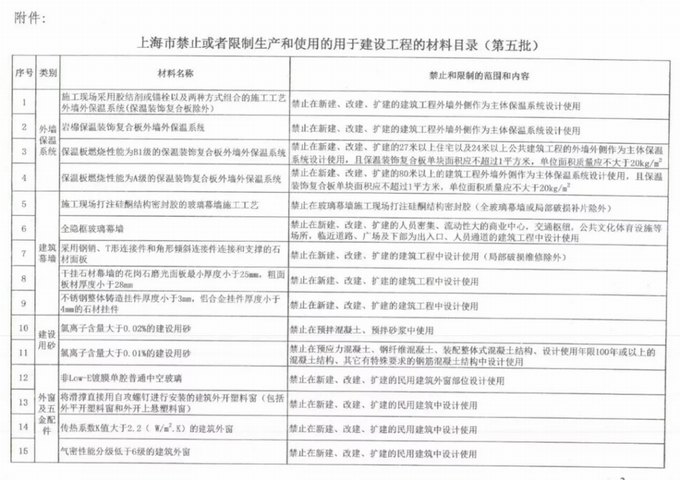 2020年10月10日,上海市住房和城鄉建設管理委員會公開發布了《上海市禁止限制生產和使用的用于建設工程的材料目錄(第五批)》(滬建建材[2020]539號)文件,給出了門窗幕墻禁限制技術目錄。