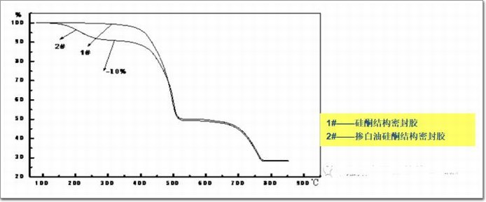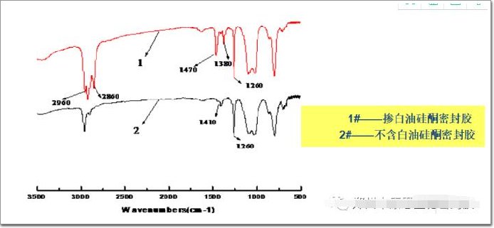 白油硅酮密封膠的鑒別方法:①接觸 “丁基密封膠” 法,如果是硅酮雙組分密封膠(如硅酮結(jié)構(gòu)密封膠、硅酮中空玻璃密封膠)中加入白油,可以用A組分包裹丁基密封膠,24h觀察丁基密封膠是否有“拉絲”的現(xiàn)象,有“拉絲”說明硅酮雙組分密封膠中添加有白油。也可以用混合好的硅酮雙組分密封膠與丁基密封膠接觸的方法來鑒別,判斷方法同樣是看是否有“拉絲”。如果是硅酮單組分密封膠(硅酮耐候密封膠或硅酮門窗密封膠)中加入白油,可以將其直接涂敷在壓成片的丁基密封膠上,判斷方法同樣是看是否有“拉絲”。②儀器分析法,依據(jù)GB/T31851-2015《硅酮結(jié)構(gòu)密封膠中烷烴增塑劑檢測(cè)方法》中的試驗(yàn)方法進(jìn)行紅外光譜(圖四)和熱重分析(圖五)來鑒別。
